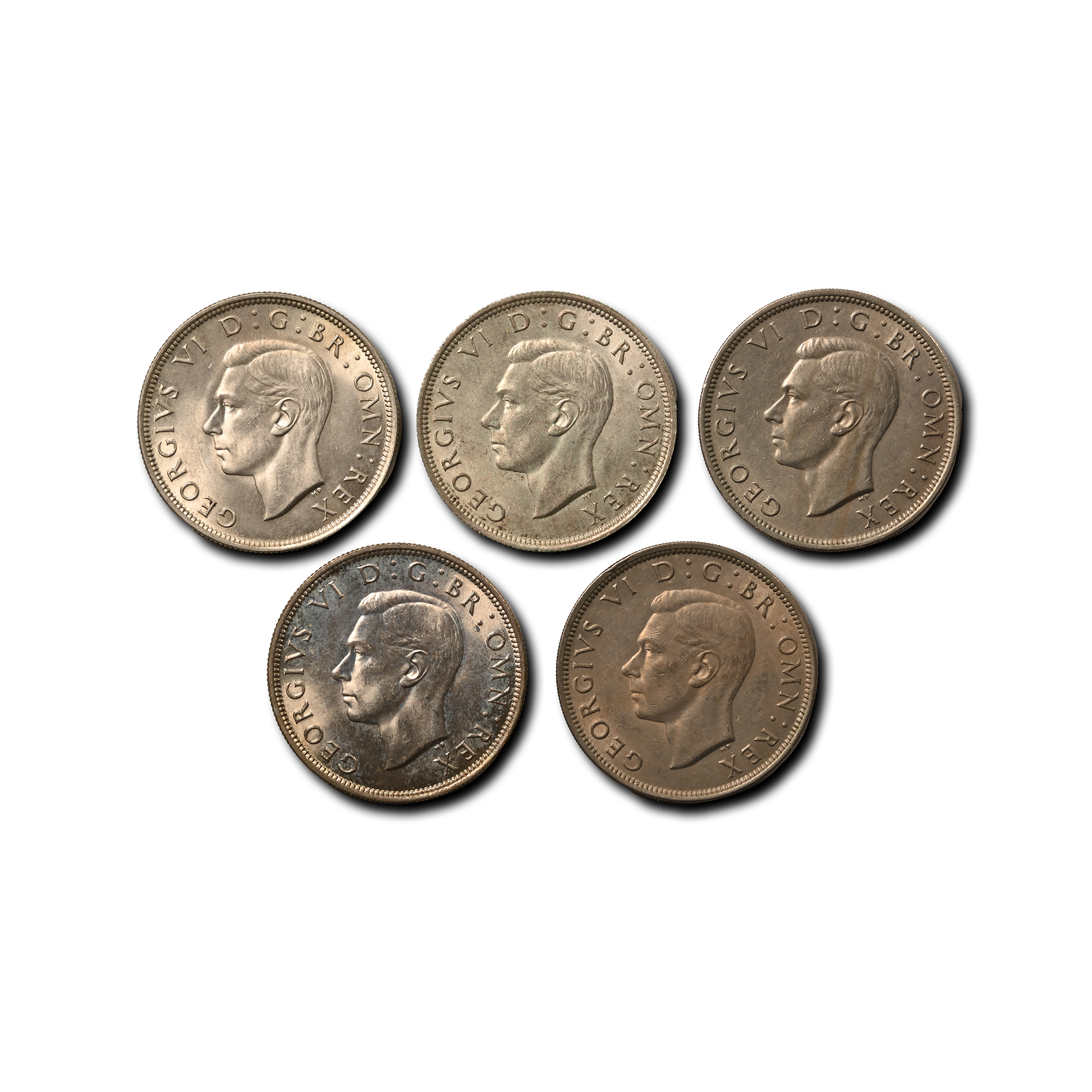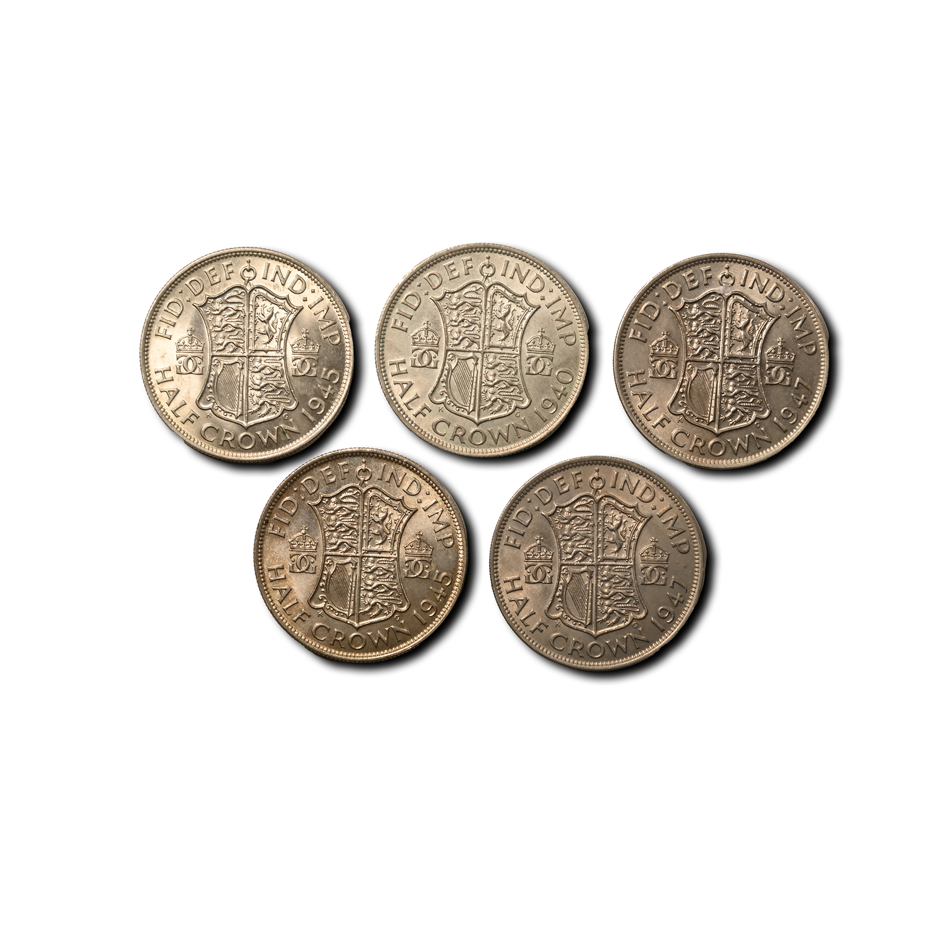 Comprising: George VI Halfcrowns dated 1940, 2 x 1945, 2 x 1947. SCBC 4080; SCBC 4101. 76.7gr total, 32mm