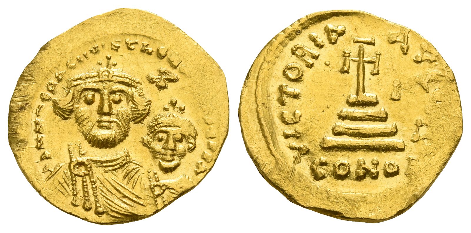 Heraclius, with Heraclius Constantine AV Solidus. Circa AD 616-625. Constantinople mint. 4th officina.