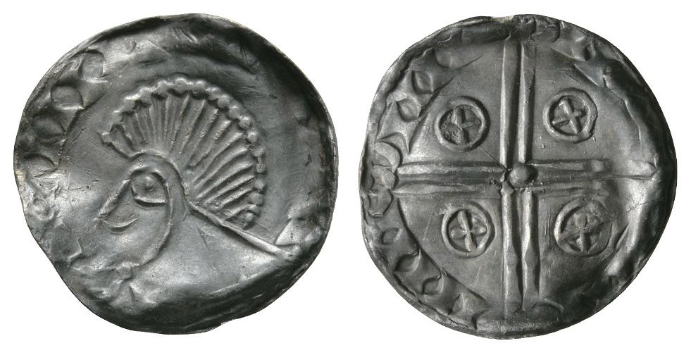 Phase V, imitative series, copying William I PAXS type reverse. Obv: crude profile bust left with blundered legend. Rev: voided long cross with X-in-annulet in angles (from the letters P A X S seen on the prototype) and blundered legend. 0.75 grams.
