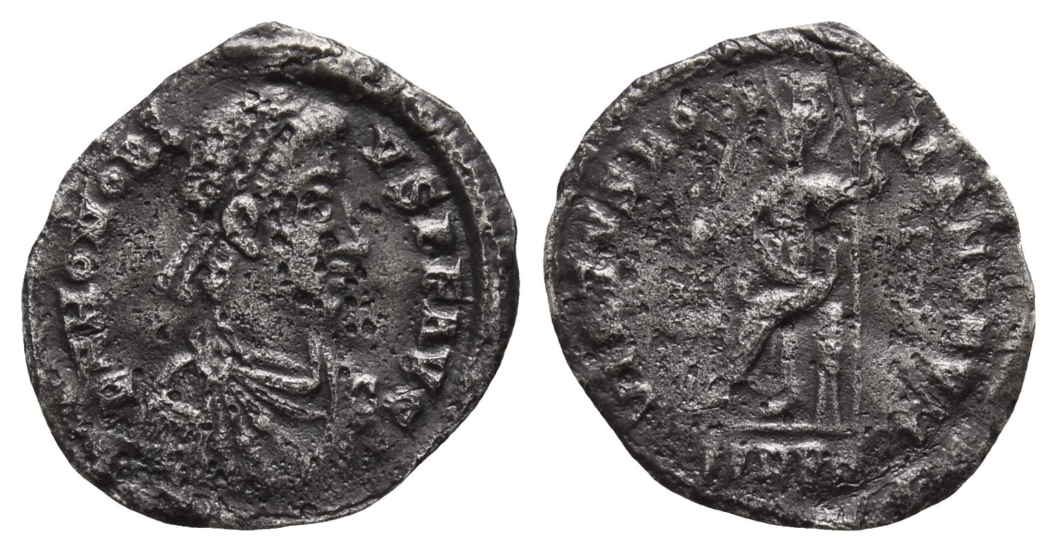 Mediolanum mint. D N HONORIVS P F AVG, pearl-diademed, draped and cuirassed bust to right / VIRTVS ROMANORVM, Roma seated to left on cuirass holding Victory and inverted spear, MDPS in exergue. RIC X 1228; RSC 59†b. 0.95gr, 16mm, 12h