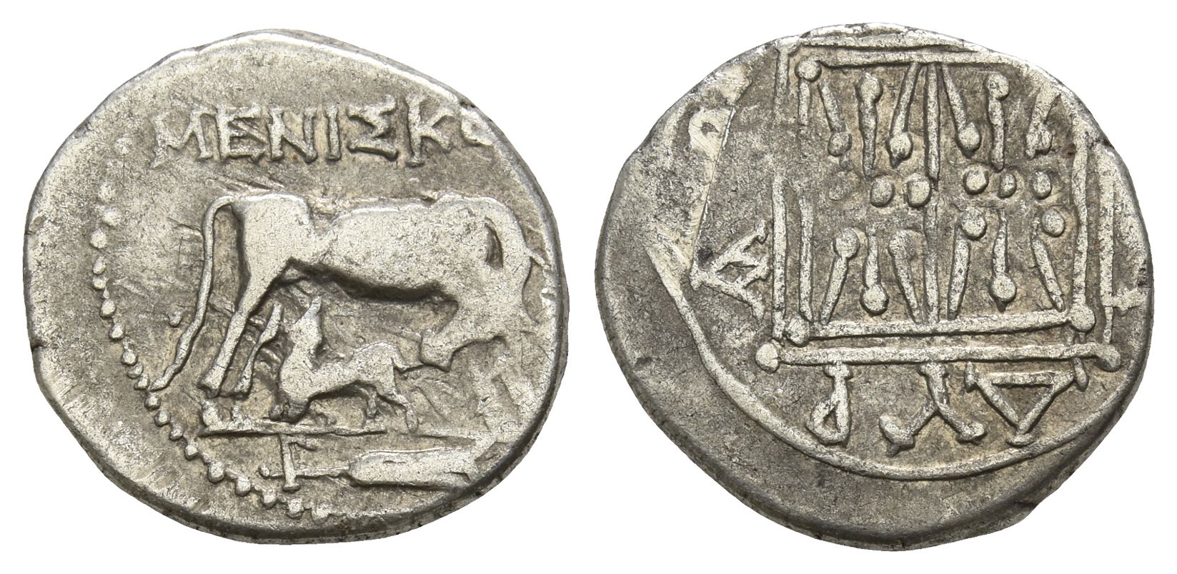 ΜΕΝΙΣΚΟΣ (Meniskos) and ΑΡΧΙΠΠΟΣ (Archippos), magistrates. Cow standing to right, head reverted, suckling calf; MENIΣKO[Σ] above, rudder in exergue / Double stellate pattern in double linear quadrangle; ΔYP AP-[XIΠ-ΠOY] around. Ceka 318; Maier 144; HGC 3, 40. 3.15gr, 18mm, 5h.