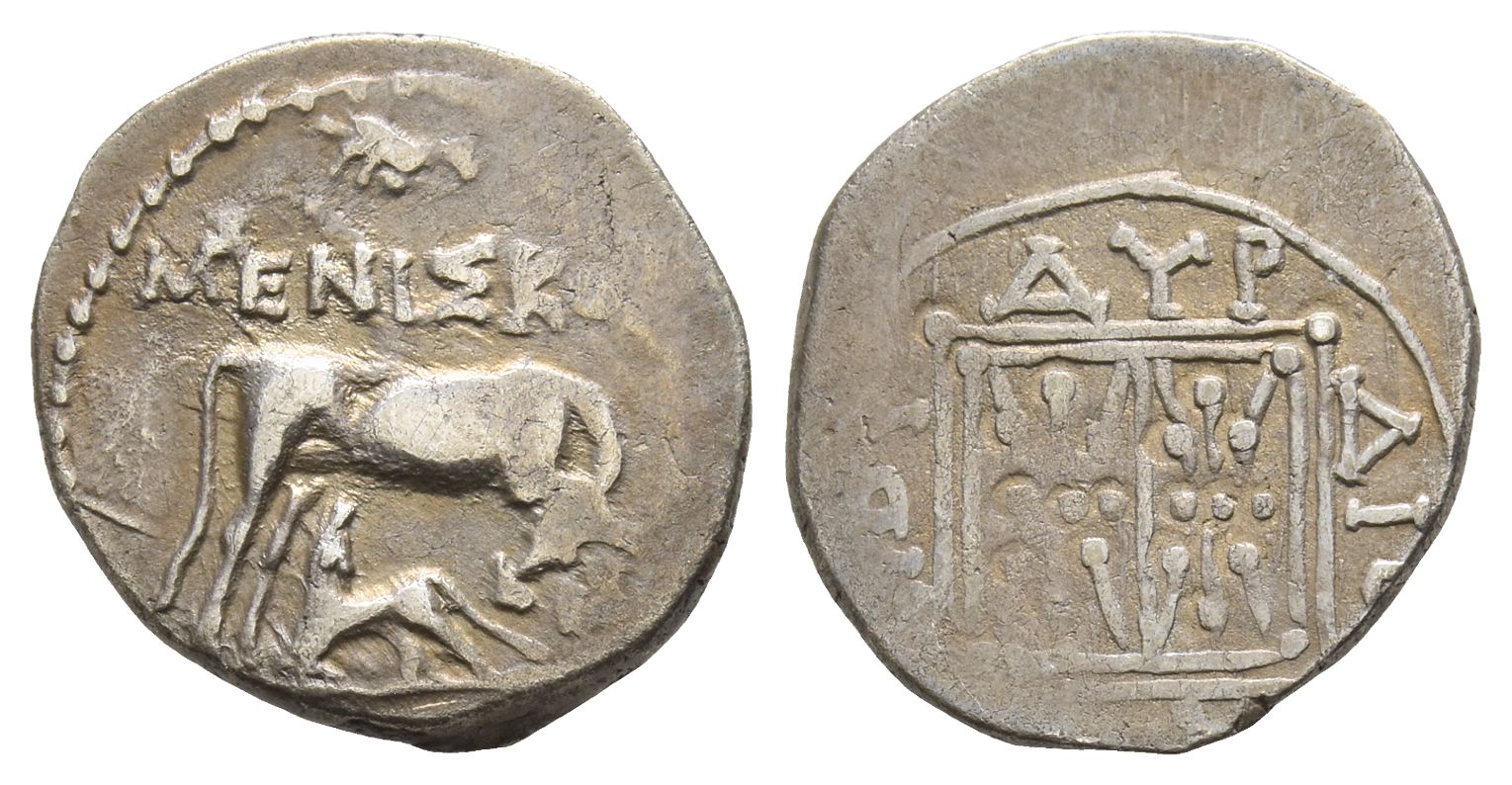 Illyria, Dyrrhachion AR Drachm. Circa 80/70-60/55 BC. ΜΕΝΙΣΚΟΣ and ΔΙΟΝΥΣΙΟΣ (Meniskos and Dionysios), magistrates.