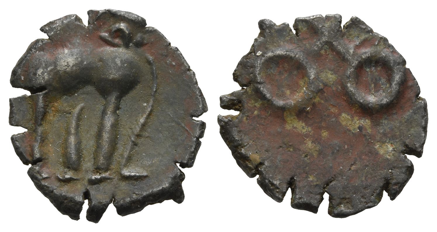 Elephant with raised trunk standing to right; [legend in Brahmi above] / Satavahana symbol. AICR 675; MACW 4941-52. 1.88gr, 19mm.