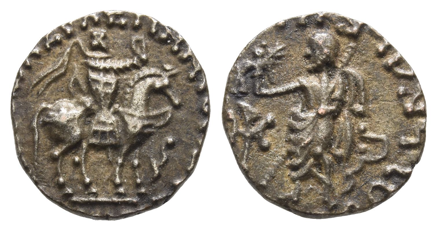 Azes on horseback to right, wearing cataphractus and holding whip aloft; Karosthi letter before horse / Zeus Nikephoros standing to left, holding transverse sceptre; monogram to left, Karoshthi letter to right. Cf. Senior 105.500D; HGC 12, 655. 2.00gr, 15mm, 7h.