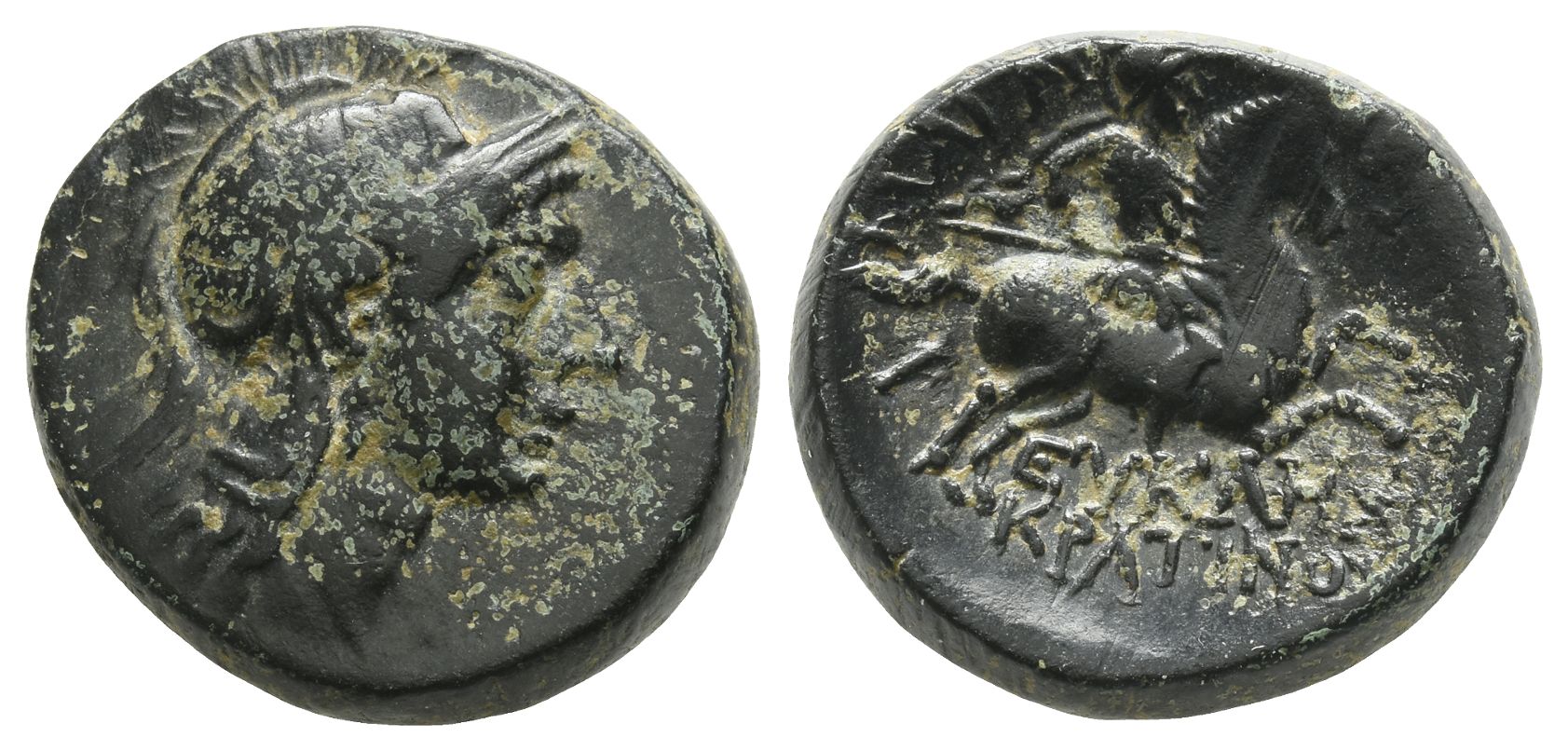 Helmeted head of Athena to right / MAΓΝ-Η[ΤΩΝ], warrior, holding spear, on horse galloping to right; I(?) to left, ΕΥΚΛΗΣ ΚΡΑTΙΝΟΣ below. Cf. SNG Kayhan 429-31 (N to left). 10.27gr, 21mm, 12h.