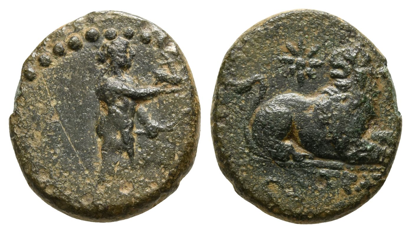 Cult statue of Apollo Didymaios standing to right, holding small stag in his right hand and bow in his left; to right, monogram / [...]ΤΡΑ[...], lion recumbent to right, head to left; above, star. Cf. Deppert-Lippitz 989-94; cf. SNG München 760. 3.70gr, 18mm, 12h.