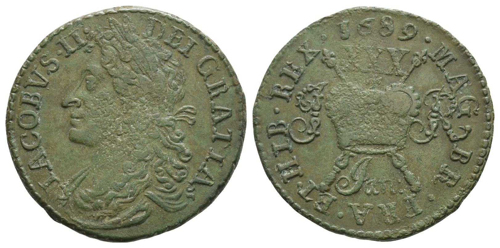 IACOBVS II DEI GRATIA with profile bust left / MAG BR FRA ET HIB REX with crown over crossed sceptres with XXX over, I - R at sides and Jan: below. SCBC 6579J; D&F 385. 12.68gr, 33mm, 12h.