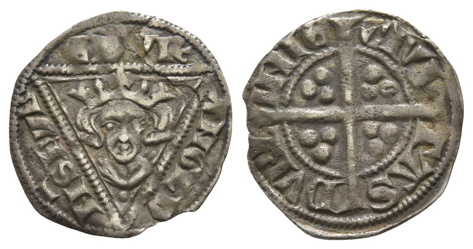 Dublin mint. Second ('ЄDW') coinage, class IVa. Late issues, struck 1297-1302. ЄDW R' ANGL D-NS ҺУB, crowned facing bust; single pellet below; all within triangle / CIVI-TAS DVBL-INIЄ, long cross pattée; trefoil of pellets in quarters. SCBC 6264. 1.32gr, 18mm, 10h.