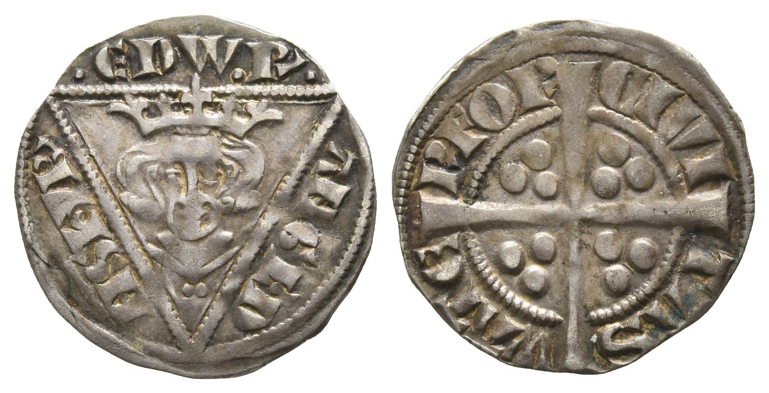Waterford mint. Second ('ЄDW') coinage. Struck 1279-1302. .ЄDW. R. ANGL' D-HS ҺУb', facing crowned bust; trefoil of pellets on breast; all within triangle / CIVI-TAS WATЄ-RFOR, long cross pattée; trefoil of pellets in quarters. SCBC 6249. 1.39gr, 19mm, 5h.