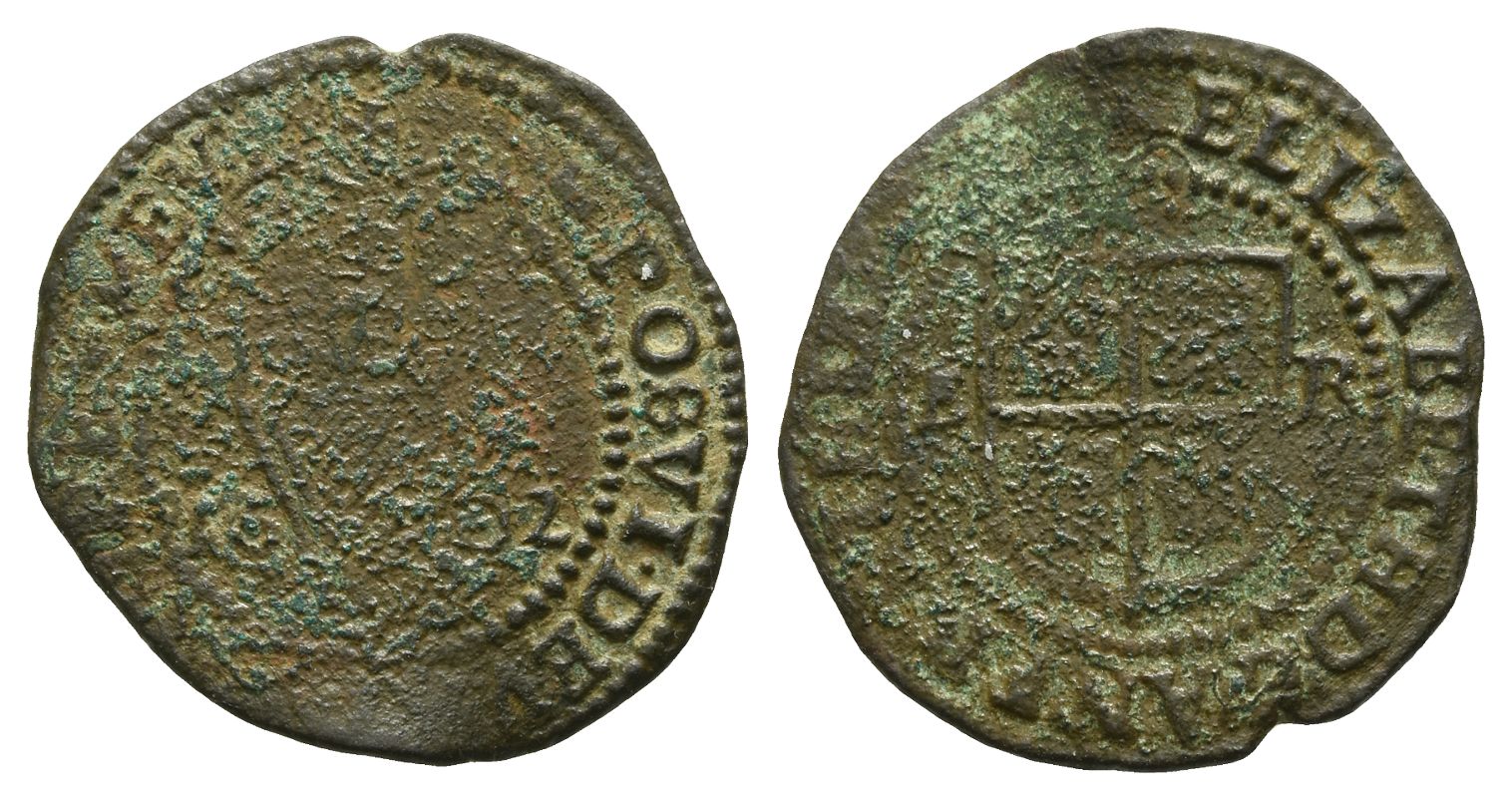 Tower (London) mint; i.m: martlet. Dated 1602. Third (base) coinage. (Martlet) ELIZABETH • D '. G '. AN '. FR '. ET • HIBER .' RE '., coat-of-arms; E R flanking / (Martlet) POSVI • DEV .' ADIVTOREM • MEV '., crowned harp, dividing date. SCBC 6510A. 1.81gr, 20mm, 7h.