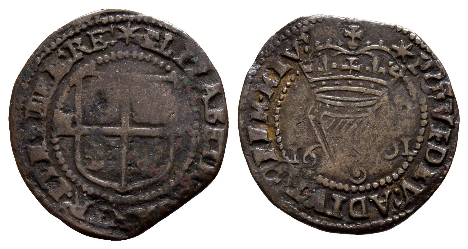 (Star) ELIZABETH • D '. G '. AN '. FR '. ET • HIBER .' RE '., coat-of-arms; E R flanking / (Star) POSVI • DEV .' ADIVTOREM • MEV '., crowned harp, dividing date. SCBC 6510A. 1.78gr, 20mm, 7h.