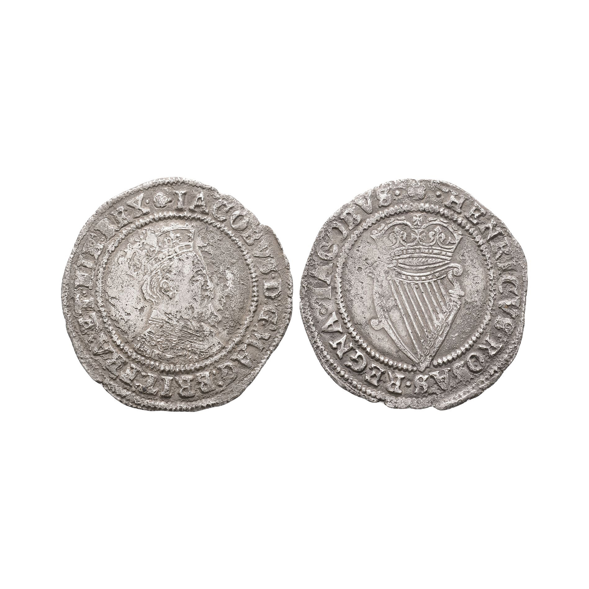 Second coinage. Obv: profile bust with IACOBVS D G MAG BRIT FRA ET HIB REX legend and 'small rose' mintmark. Rev: crowned harp with HENRICVS ROSAS REGNA IACOBVS legend. 3.81 grams, 28 mm.