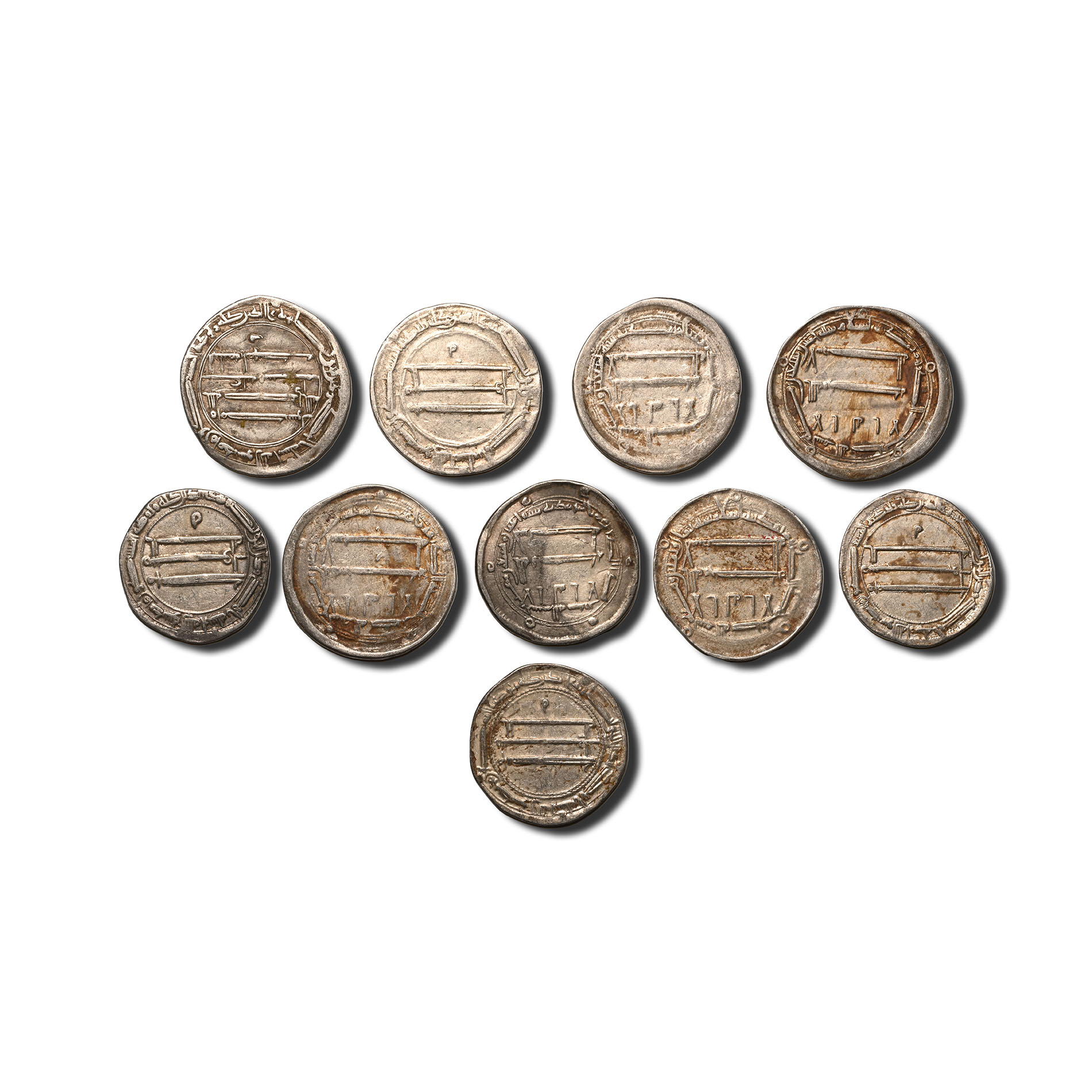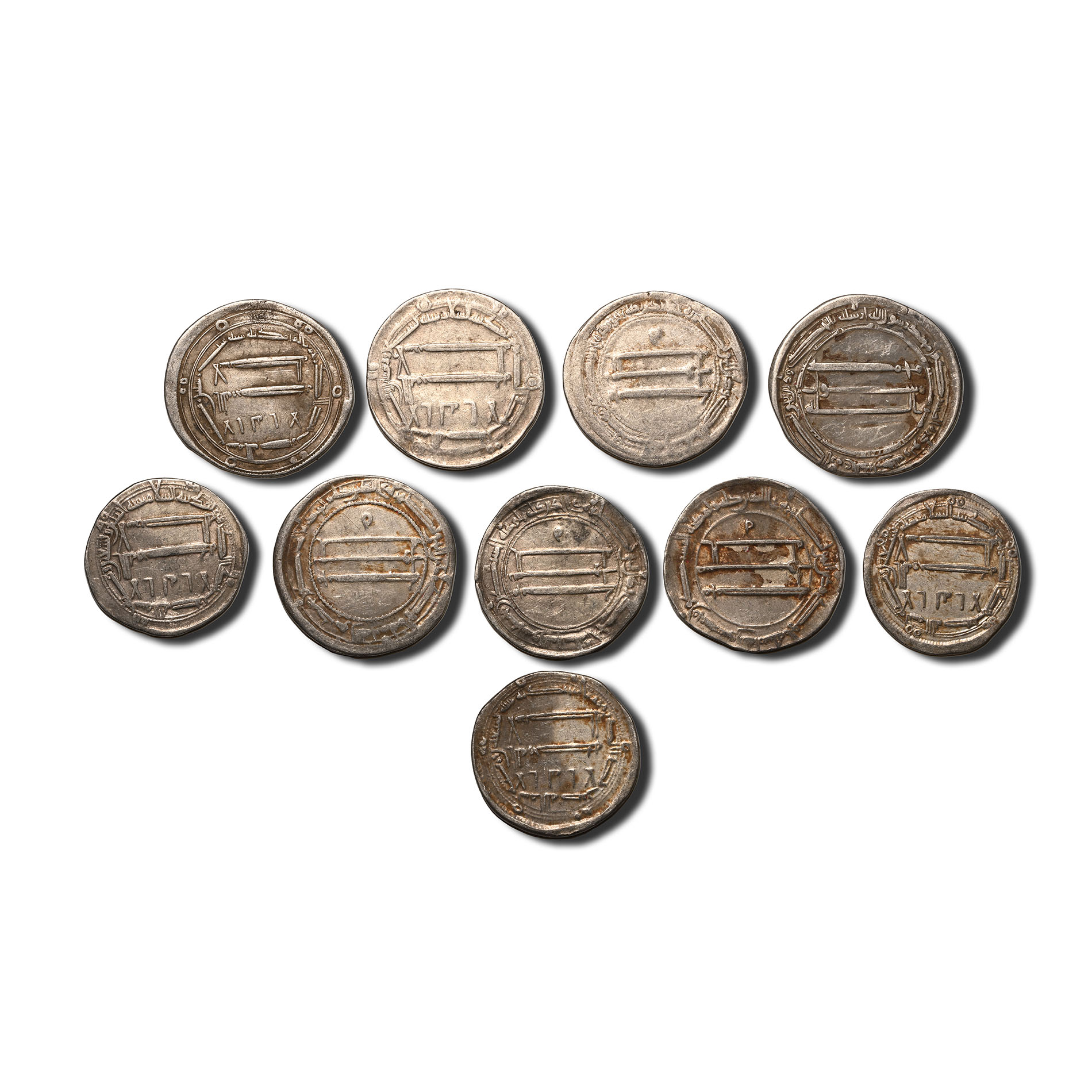 Ten silver Dirhams from the Abbasid dynasty. 29.29gr total