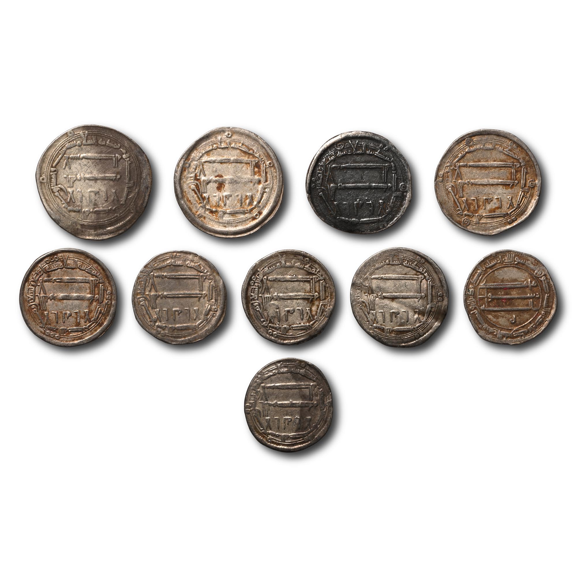 Ten silver Dirhams of the Abbasid dynasty. 29.03gr total