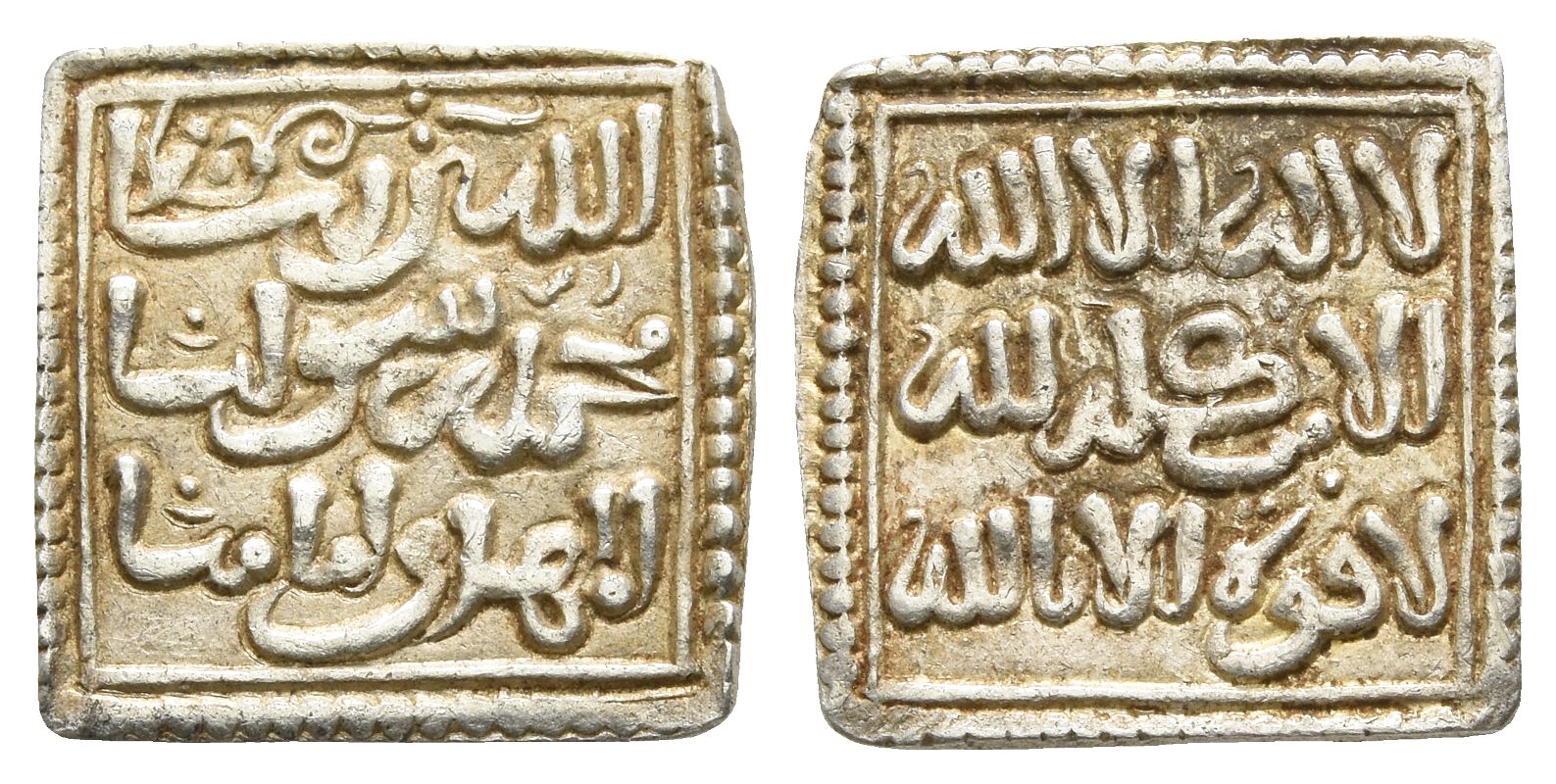 Time of Abu Ya'qub Yusuf I to Abu'l-'Ula Idris II. Uncertain mint, without date. Square type. Legend in Arabic in three lines: 'There is no deity but Allah; The entire affair belongs to Allah; There is no strength except with Allah' / Legend in Arabic in three lines: 'Allah is our Lord; Muhammad is our messenger; Al-Mahdi is our leader'. Hazard 1085; Album 496; ICV 716. 1.53gr, 15mm, 12h.