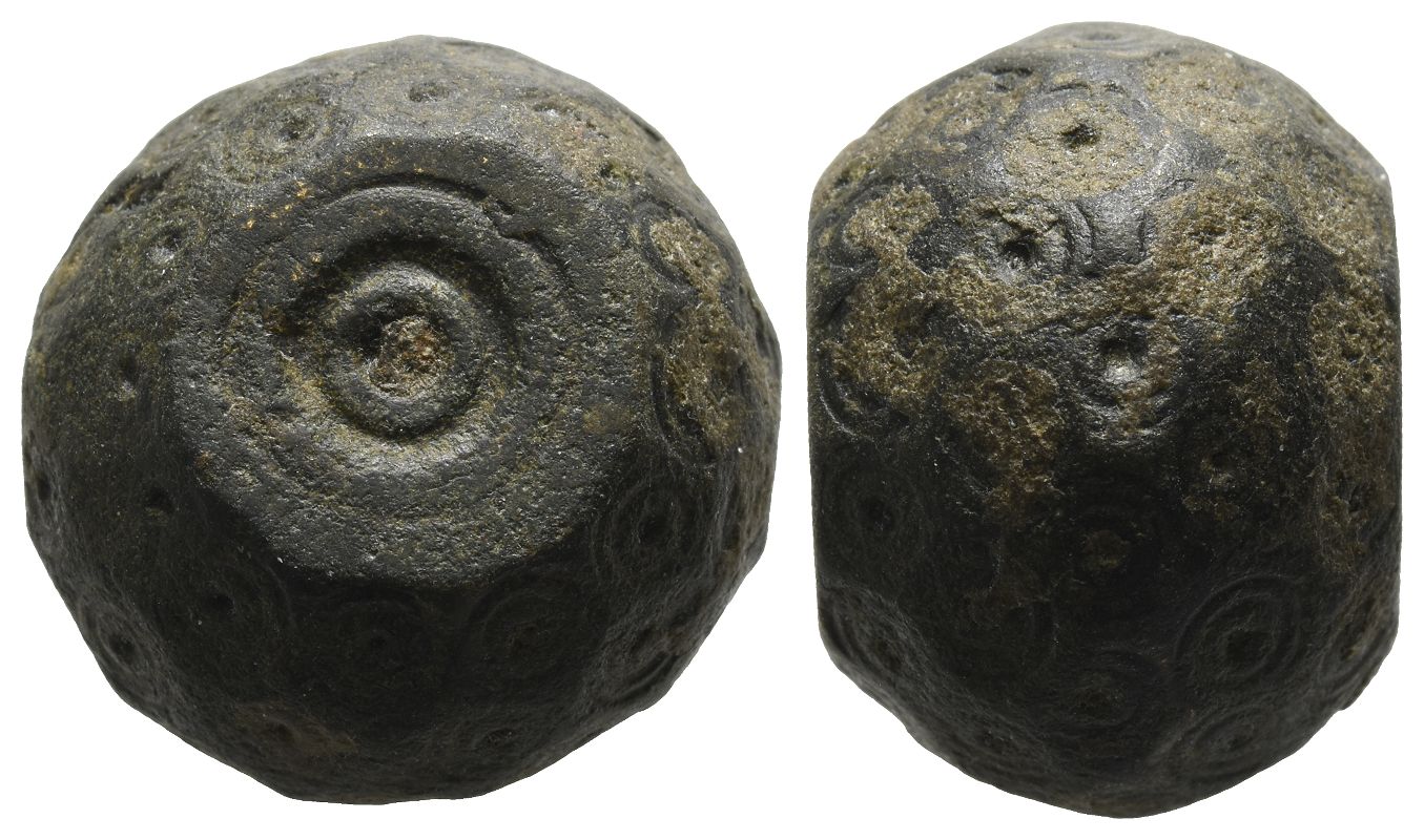 A flattened sphere doubly truncated in form; punched on the top and bottom with a large bird's eye pattern; the main body of the weight decorated with five rows of bird's eyes. CPAI 1, 127 (Southern Anatolia). 57.37gr, 25mm x 19mm.