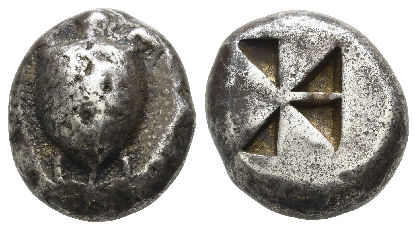 Sea turtle, head in profile, with thin collar and row of dots down its back / Incuse square with mill-sail pattern. Meadows, Aegina, Group IIa-b; Milbank pl. I, 11; Asyut Group IV; HGC 6, 429. 12,22gr, 20mm.