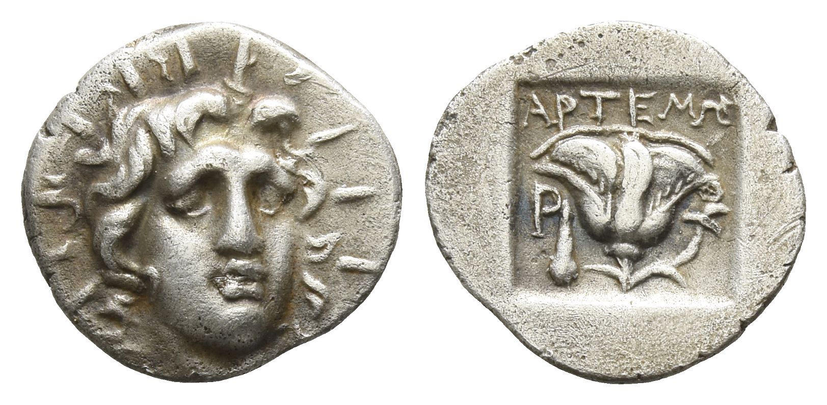 Radiate head of Helios facing slightly to right / ΑΡΤΕΜΩΝ, rose with bud to right; P-O flanking, club to left; all within incuse square. Jenkins, Rhodian 44; HN Online 103; HGC 6, 1462. 1.38gr, 13mm, 12h.
