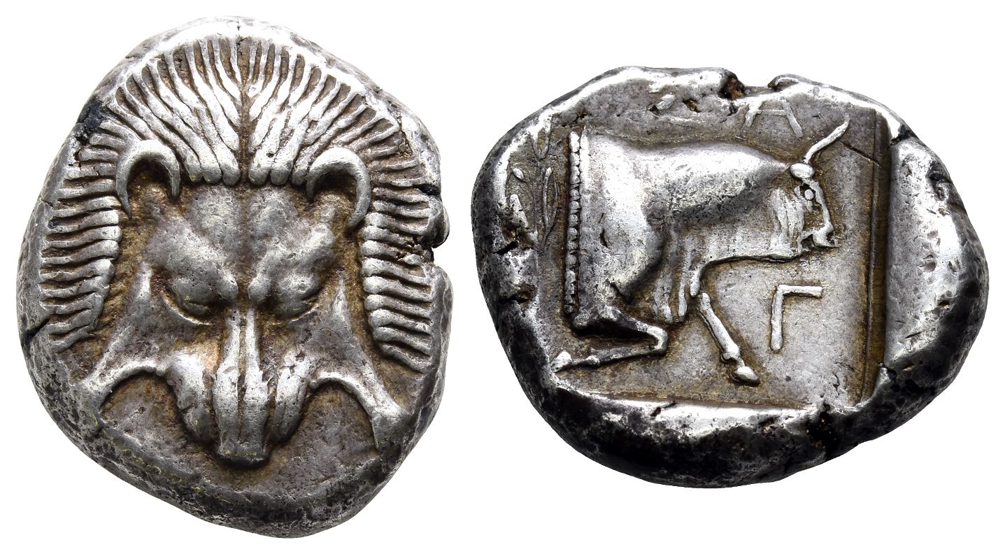 Dated RY 3 (452/1 BC) (restoration era date). Facing lion scalp / Forepart of ox to right; ΣA above, olive branch to left, Γ (date) below; all within incuse square. Barron Class VII, 72a (A33/P72) (this coin); Slg. O'Hagan 591 (this coin); Coll. Berlin (Fox coll.); HGC 6, 1190. 12.96gr, 24mm, 9h.