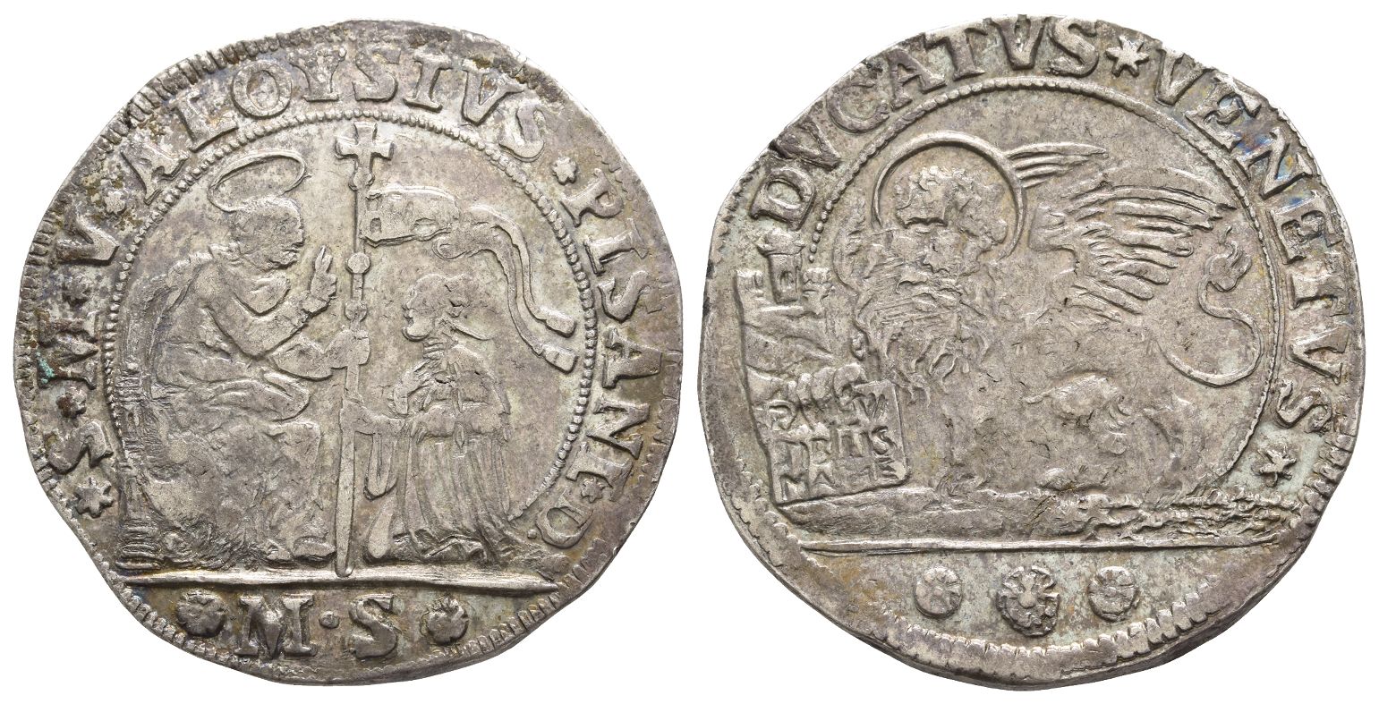 ✱ S ✱ M ✱ V ✱ ALOYSIVS ✱ PISANI ✱D., St. Mark seated to right, presenting cross-tipped banner to Doge kneeling to left; ❀ M • S ❀ in exergue / DVCATVS ✱ VENETVS ✱, winged lion of St. Mark to left, resting forepaw upon open Gospels; castle to left, ❀❀❀ in exergue. CNI 38; Paolucci - (cf. 16). 22.65gr, 39mm, 3h.