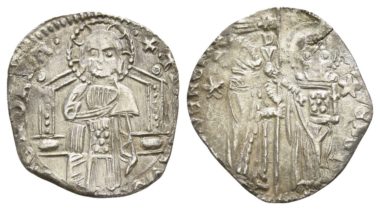 [ANTO] VENER[I DVX S M] VENET[I], Doge and St Mark standing facing, holding banner between them; star in left and right fields / • ✠ • T[IBI LAVS 7] GLORIA • , Christ Pantokrator enthroned facing. Cf. Paolucci 3. 1.84gr, 21mm, 1h.