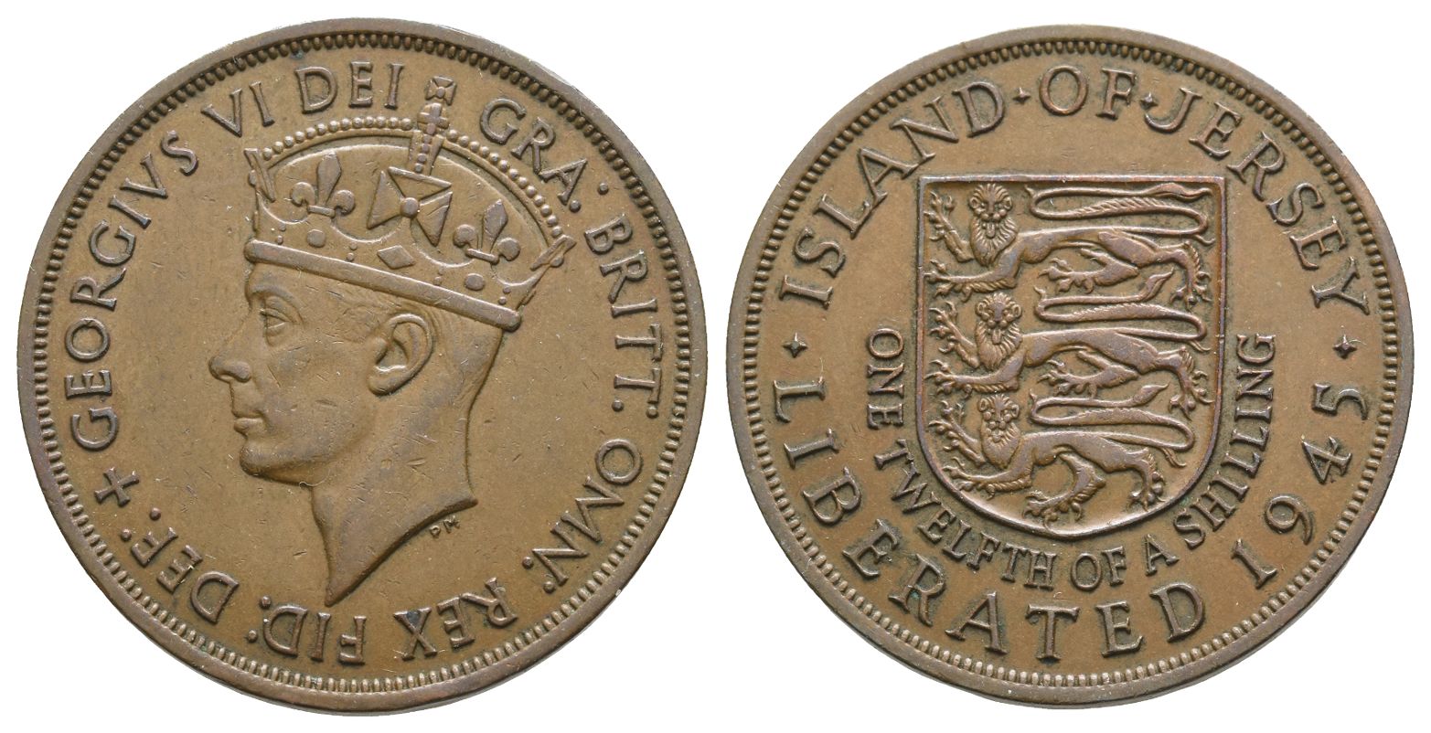 + GEORGIVS VI DEI GRA: BRITT: OMN: REX FID: DEF:, crowned head to left; PM in small lettering beneath truncation / ISLAND OF JERSEY above coat-of-arms, ONE TWELFTH OF A SHILLING and LIBERATED 1945 below. KM 19. 9.47gr, 31mm, 12h.