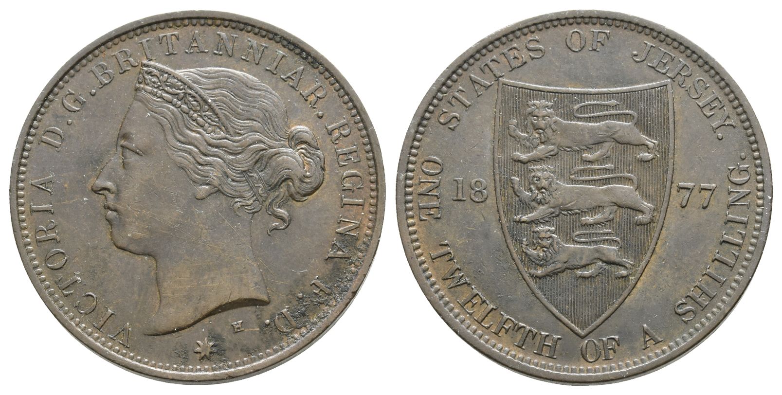 Designs by Leonard Charles Wyon. VICTORIA D. G. BRITANNIAR. REGINA F. D., diademed head to left; H (mintmark) and star below / STATES OF JERSEY. and ONE TWELFTH OF A SHILLING., pointed coat-of-arms, date across field. KM 8. 9.55gr, 30mm, 12h.