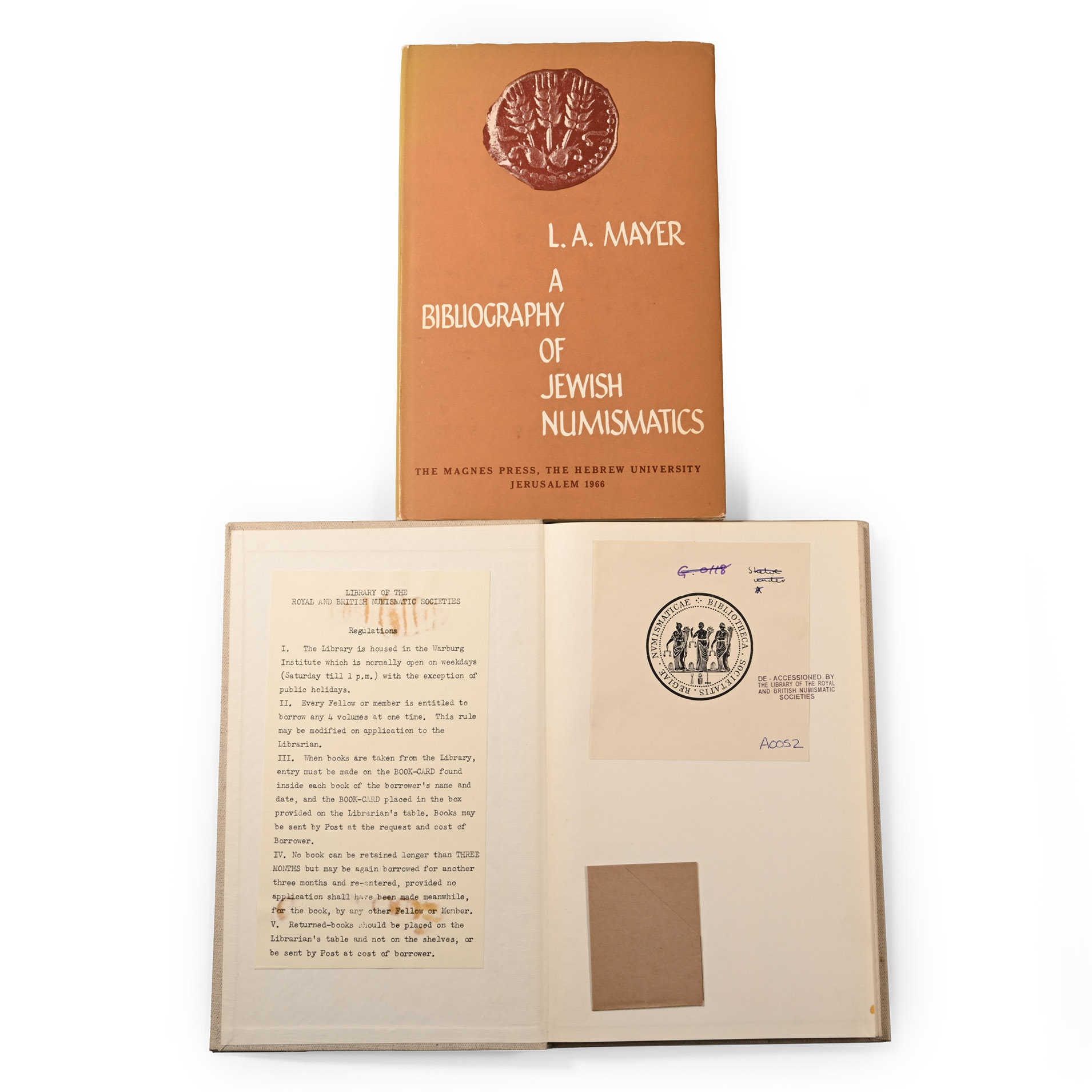 L.A. Mayer - Bibliography of Jewish Numismatics - Jerusalem, 1966, hardback with dustwrapper, 78pp; L.A. Mayer - Bibliography of Jewish Numismatics - Jerusalem, 1966, hardback with cloth covers, 78pp, library binding. 589 grams total, 24.5 x 16 cm each