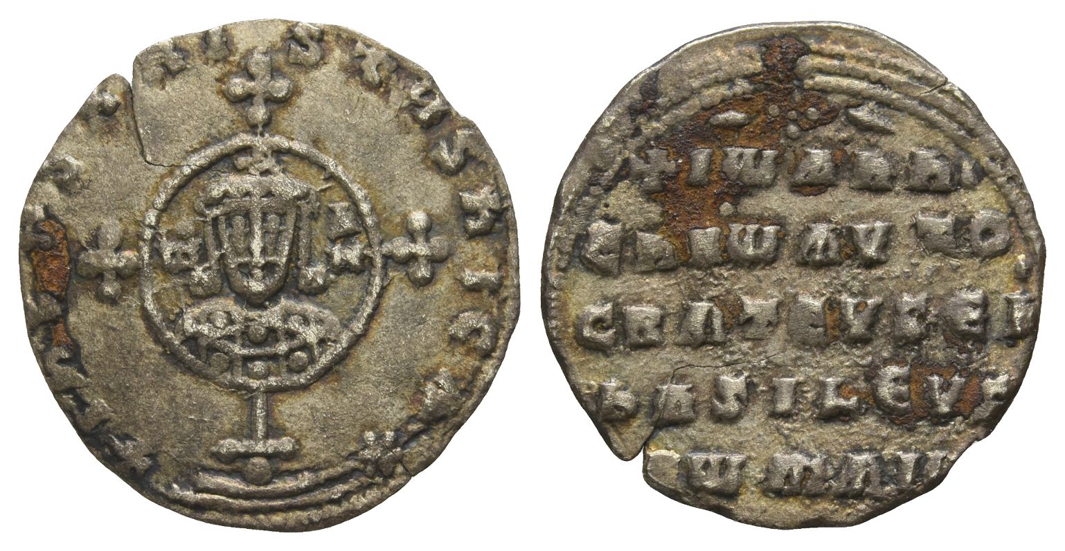 Constantinople mint. + IҺSЧS XRISTЧS ҺICA ✶, crosslet set on globus above two steps; in central medallion, crowned bust facing, Iധ AҺ flanking / + IധAҺҺ, ЄҺ X'ധ AVTOCRAT, ЄVSЄЬ' ЬASILЄVS RധMAIധ' in five lines; ornaments above and below. DOC 7a; SB 1792. 1.58gr, 20mm, 6h