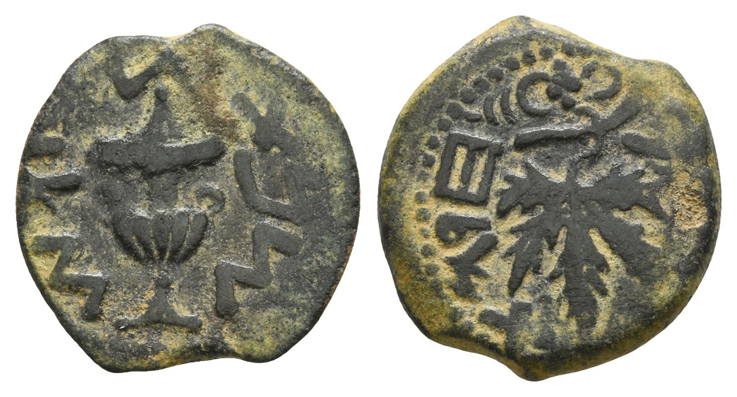 'Year three' in Paleo-Hebrew, amphora with broad rim, two handles and a lid / 'The freedom of Zion' in Paleo-Hebrew; vine leaf on small branch with tendril. TJC 204; Sofaer 31-35; Hendin GBC 6, 6392; Hendin GBC 5, 1363. 2.64gr, 16mm, 6h.
