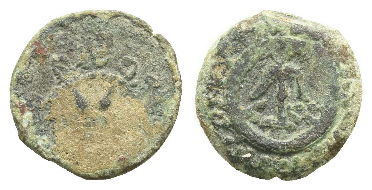 Star within dotted circle; legend around / Anchor within circle; legend around. Cf. Hendin 6191a; cf. Meshorer Group L. 1.44gr, 14mm.