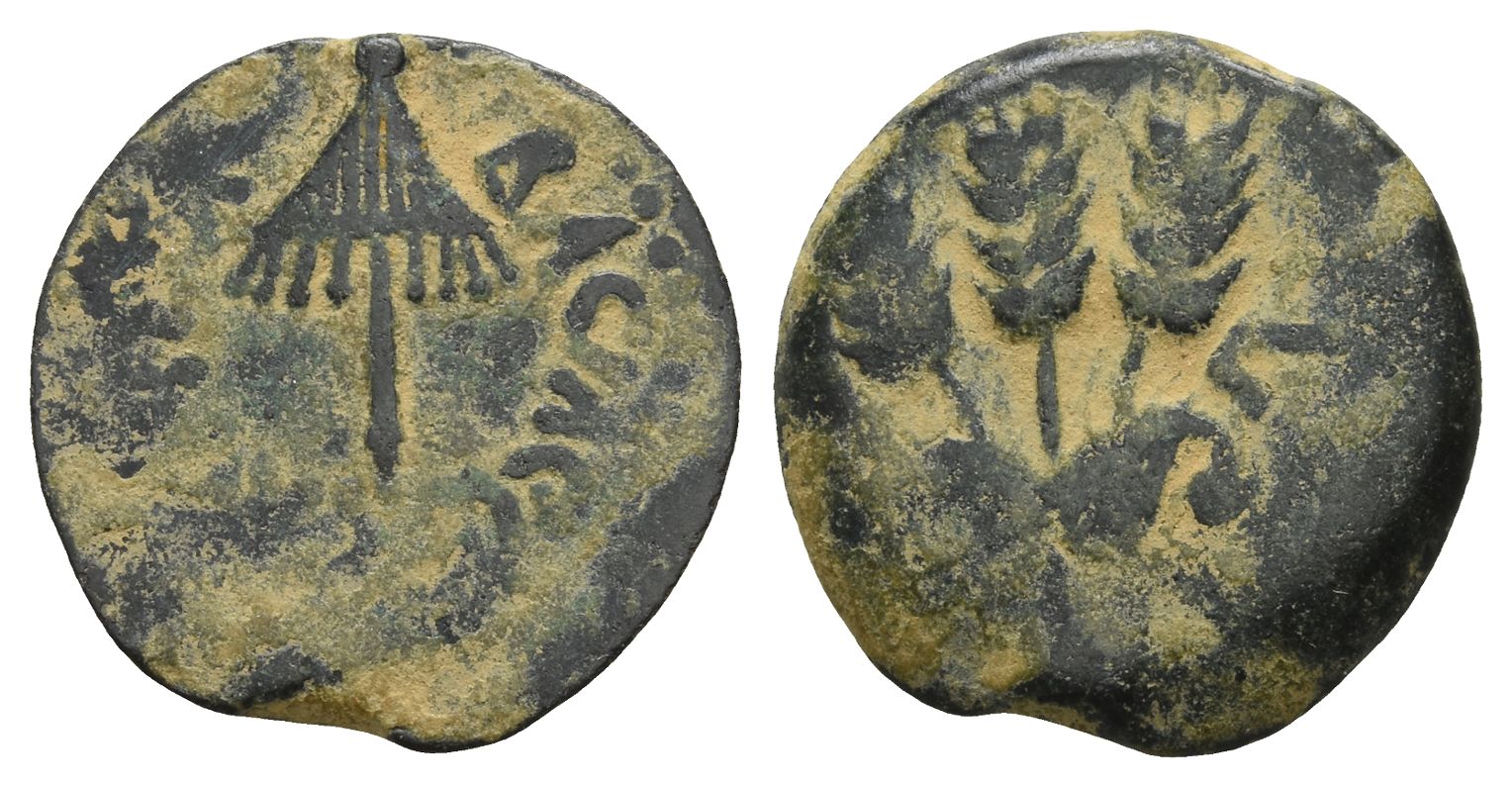 Jerusalem mint. Dated RY 6 (41/2 CE). BACIΛЄ[ധC AΓPIΠA], canopy / Three ears of corn; [L] Ϛ (date) across fields. RPC I 4981; TJC 120; Hendin GBC 6, 6274; Hendin GBC 5, 1244; Sofaer 153-6. 2.66gr, 18mm, 10h.