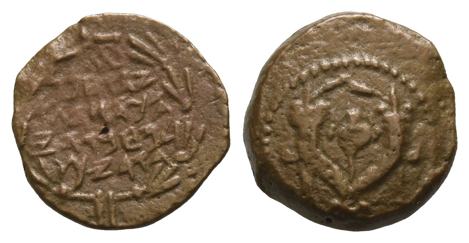 Jerusalem mint. A over "Yehohanan the High Priest and head of the Council of the Jews" in paleo-Hebrew within wreath / Two cornucopiae splayed outward, adorned with ribbons; pomegranate/poppy between. Hendin 6171; TJC A; Sofaer 6-29. 1.67gr, 14mm, 12h.