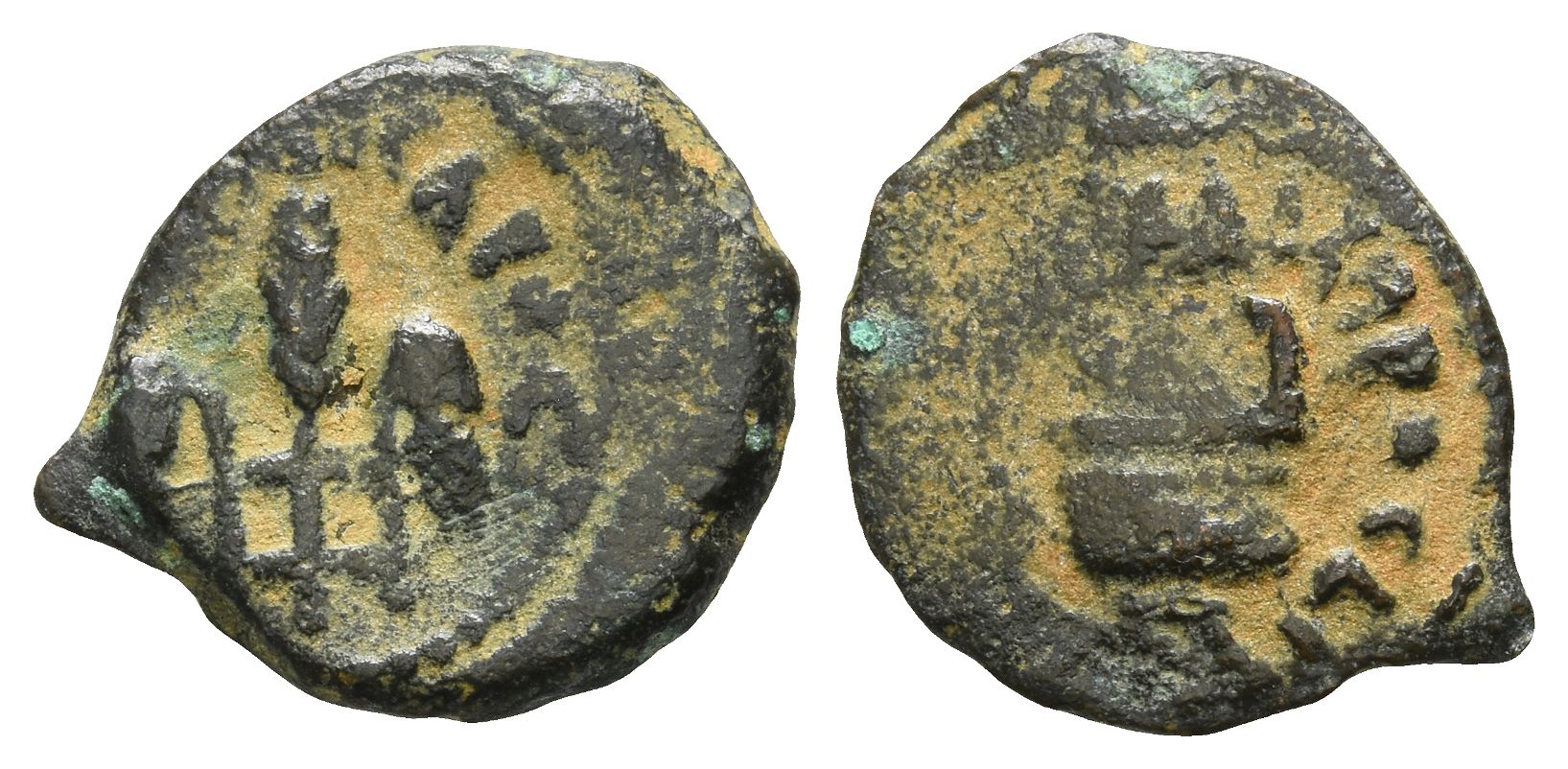 Jerusalem mint. Dated RY 16 of Tiberius (29/30 CE). In the names of Julia Augusta (Livia) and Tiberius. [IOYΛIA KAI]CAPOC, three bound grain ears / [TIBЄPIOY] KAICAPOC L Iς (date), simpulum to left. RPC I 4967; Hendin GBC 6, 6370; Hendin GBC 5, 1341; TJC 331. 1.96gr, 15mm, 12h.