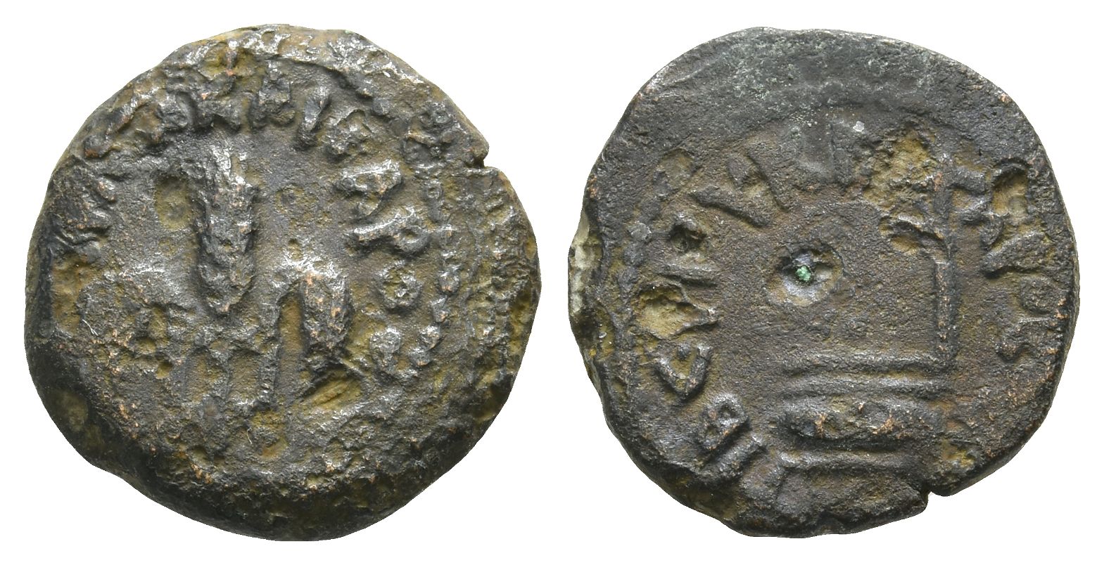Judaea. Procurators, Pontius Pilate AE Prutah. Dated RY 16 of Tiberius (29/30 CE). Jerusalem mint. In the names of Julia Augusta (Livia) and Tiberius.