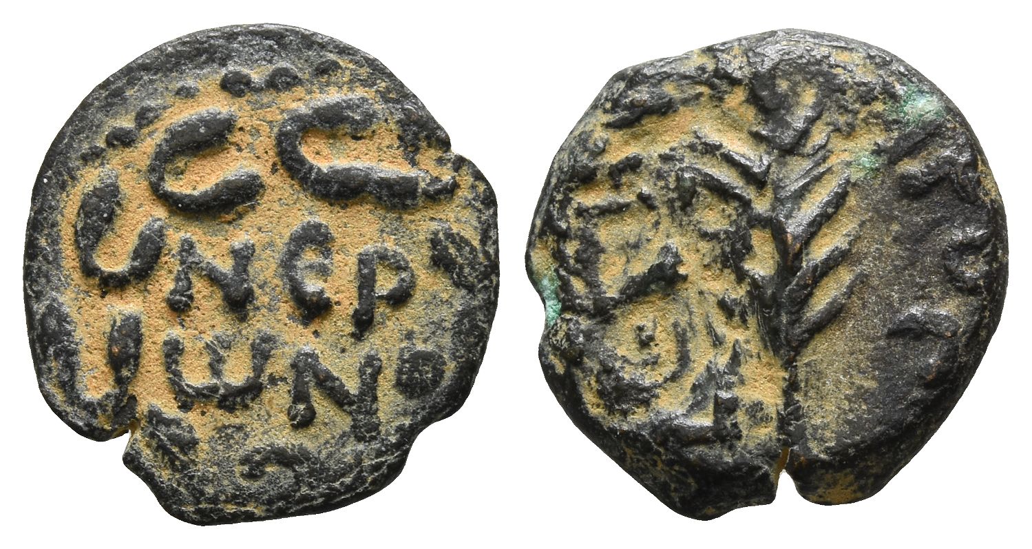 Jerusalem mint. In the name of Nero. Dated RY 5 of Nero (58/9 CE). NЄPധNOC in three lines within wreath / L Є KAIC-APOC, palm branch. RPC I, 4972; TJC 345; Hendin GBC 6, 6380; Hendin GBC 5, 1351. 1.92gr, 15mm, 12h.