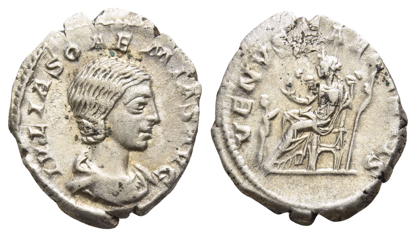 IVLIA SOAEMIAS AVG, draped bust to right / VENVS CAELESTIS, Venus seated to left, holding apple and sceptre; child at feet. RIC IV 243 (Elagabalus); BMCRE 56 (Elagabalus); RSC 14. 2.63gr, 20mm, 6h.