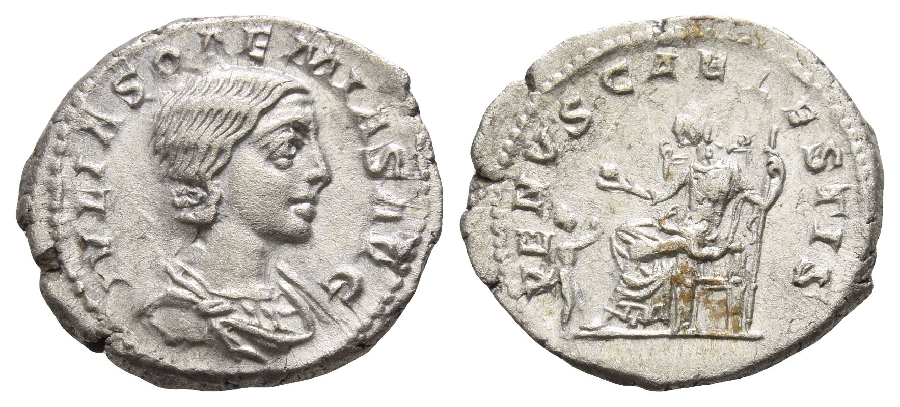 IVLIA SOAEMIAS AVG, draped bust to right / VENVS CAELESTIS, Venus seated to left, holding apple and sceptre; child at feet. RIC IV 243 (Elagabalus); BMCRE 56 (Elagabalus); RSC 14. 3.32gr, 20mm, 6h.