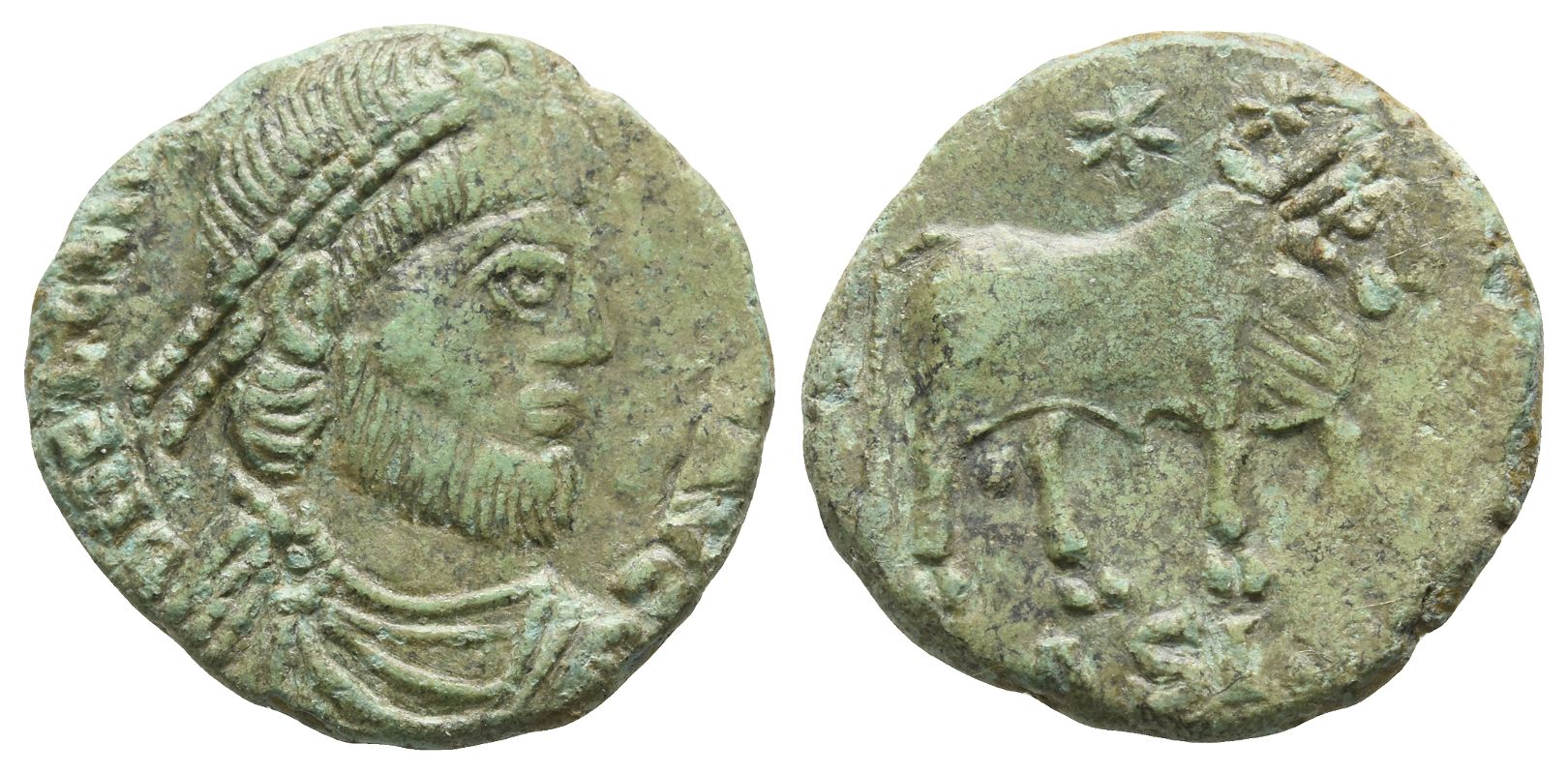 Pearl-diademed, draped, and cuirassed bust to right / Bull standing to right; two stars above. For prototype: cf. RIC VIII 411-3. 6.58gr, 22mm, 6h.