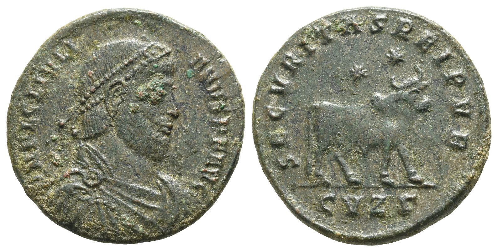 D N FL CL IVLIANVS P F AVG, pearl-diademed, draped and cuirassed bust to right / SECVRITAS REIPVB, bull standing to right; two stars above, CVZΓ in exergue. RIC VIII 127. 8.91gr, 28mm, 6h.