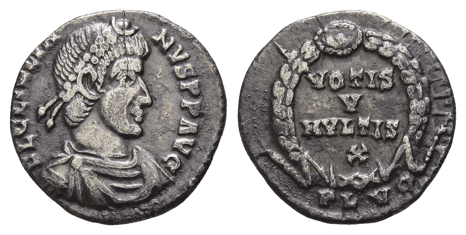 Lyon mint; struck AD 360-363. FL CL IVLIANVS PP AVG, pearl-diademed, draped and cuirassed bust to right / VOTIS V MVLTIS X, in four lines within wreath, PLVG in exergue. RIC 227. 1.98gr, 16mm, 1h