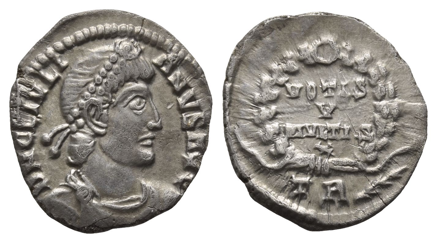 Treveri mint; struck AD 360-363. D N CL IVLIANVS AVG, pearl-diademed, draped and cuirassed bust to right / VOTIS V MVLTIS X in four lines within wreath with jewel at apex; TR (branch) in exergue. RIC 365; RSC 157†b. 1.71gr, 17mm, 7h