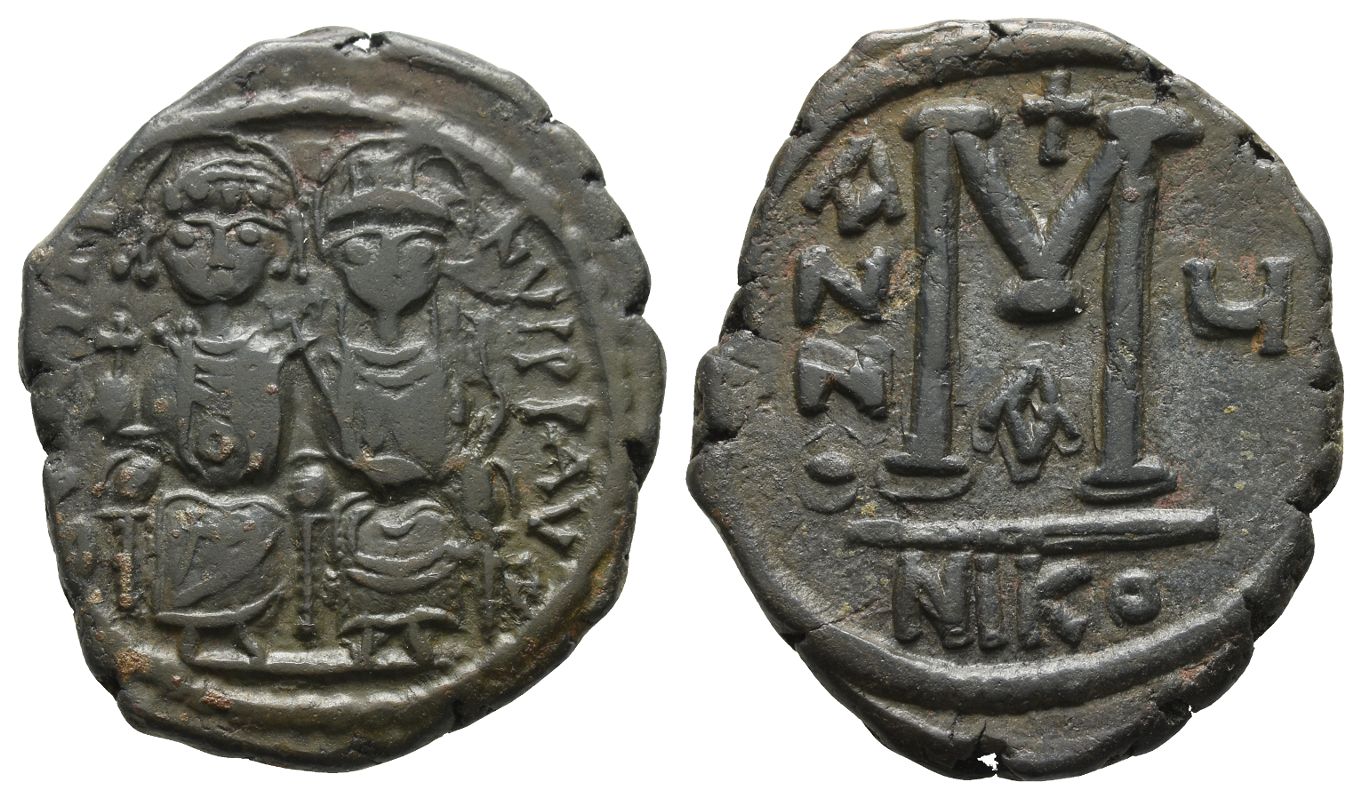 D N IVSTINVS P P AVG, Justin, holding globus cruciger, and Sophia, holding cruciform sceptre, seated facing on double throne, both wearing nimbus crown / Large M; cross above, A N N O Ч (date) across field; A below, NIKO in exergue. DOC 95a; MIBE 46; SB 369. 13.92gr, 32mm, 6h.
