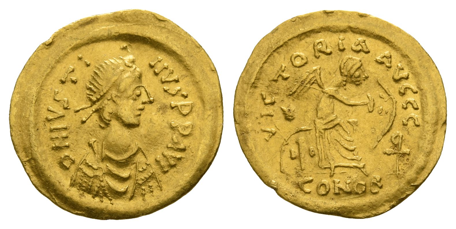 Constantinople mint. D N IVSTINVS P P AVI, diademed, draped and cuirassed bust to right / VICTORIA AVCCC, Victory seated to right, inscribing shield; star to left, inverted staurogram to right; CONOB in exergue. MIBE 10; DOC 12; SB 352. 2.18gr, 17mm, 6h
