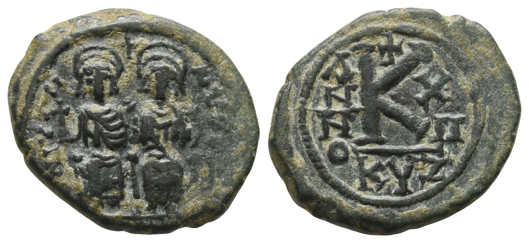 Justin II, with Sophia AE 20 Nummi or Half Follis. AD 565-578.
