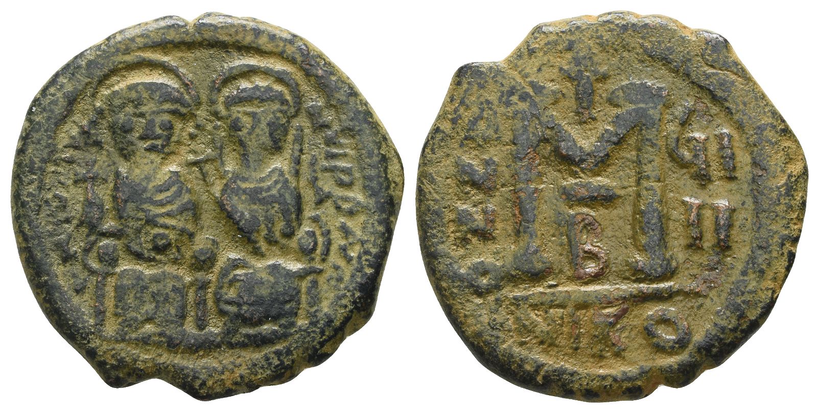 Justin II, with Sophia AE 40 Nummi or Follis. AD 565-578.