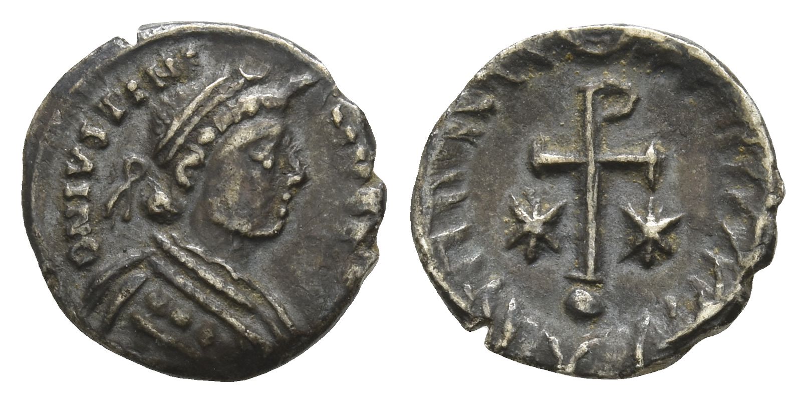 Ravenna mint. Struck AD 552-565. D N IVSTINI-ANVS P [...], diademed and cuirassed(?) bust to right / Stars flanking staurogram on globe; all within wreath. DOC 339; MIBE 78; Ranieri 361; SB 320. 0.84gr, 12mm, 6h.