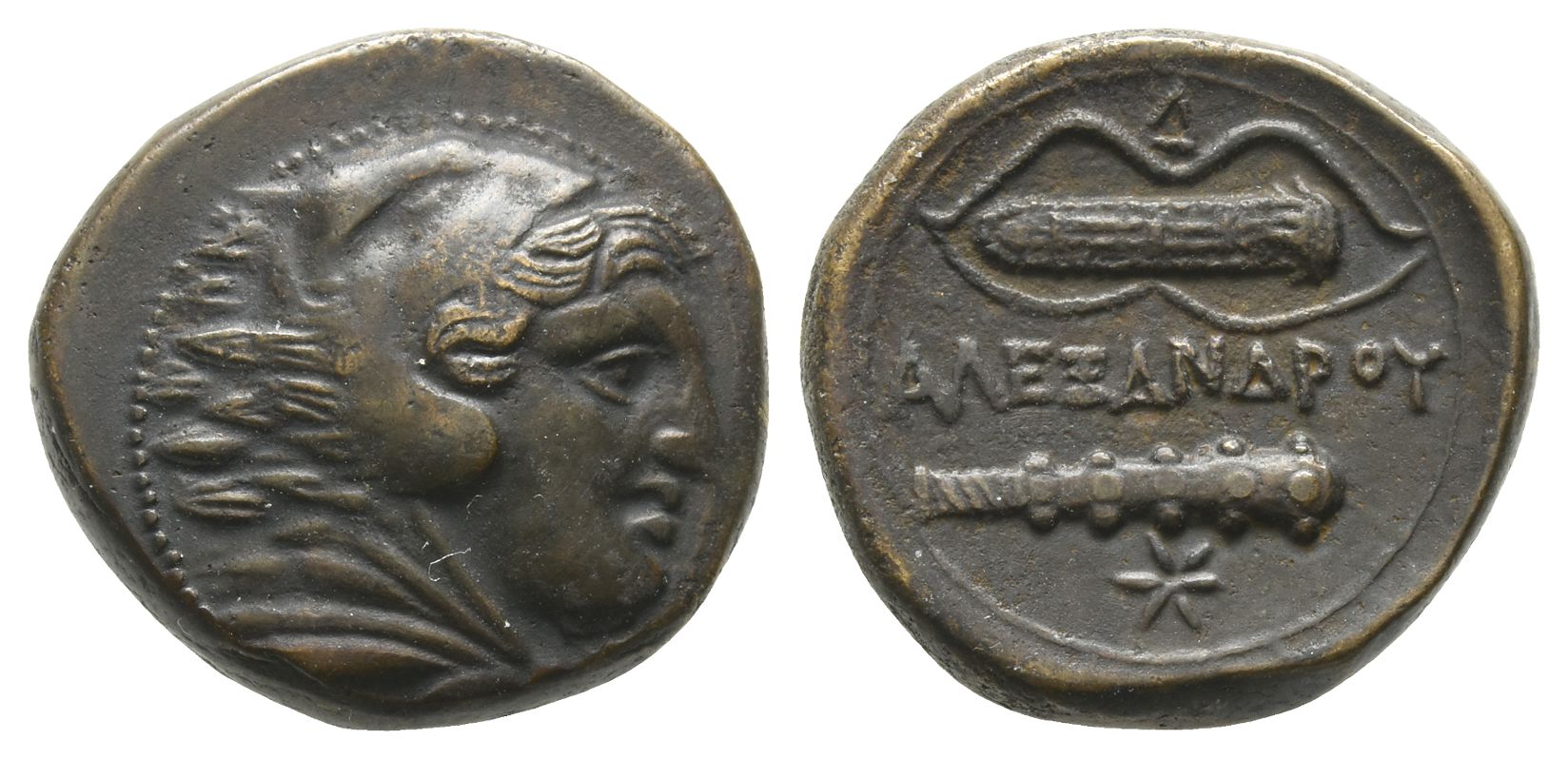 Head of Herakles to right, wearing lion skin / ΑΛΕΞΑΝΔΡΟΥ, quiver-over-bow and club to right; Δ above, star below. Price 277 var. (club to left). 7.04gr, 20mm, 2h.