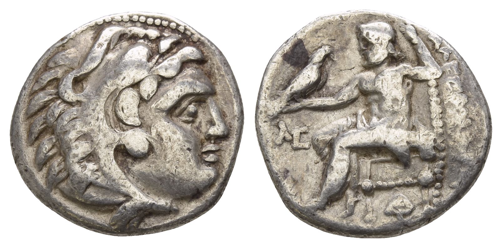 Abydos mint; struck circa 310-301 BC. In the name and types of Alexander III of Macedon. Head of Herakles to right, wearing lion skin headdress, paws tied beneath chin / ΑΛΕΞΑΝΔΡΟΥ, Zeus seated to left on backless throne, right leg drawn back, his feet resting on a low foot rest, holding long sceptre in his left hand and, in his right, eagle standing to right with closed wings; ME monogram in left field, ivy leaf beneath throne. Price 1560; ADM II Series XIX. 4.18gr, 17mm, 12h