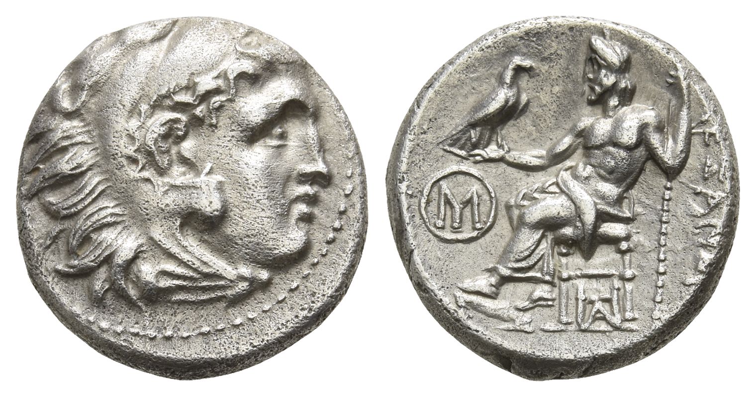 Head of Herakles to right, wearing lion skin headdress, paws tied beneath chin / ΑΛΕΞΑΝΔΡΟΥ, Zeus seated to left on backless throne, right leg drawn back, his feet resting on low foot rest, holding long sceptre in his left hand and, in his right, eagle standing to right with closed wings; M or monogram of MI within circle in left field, monogram of HA beneath throne. Price 2687 var. (monogram beneath throne); ADM Series XX, 404 corr. (same); SNG Alpha Bank 647-8. 4.17gr, 17mm, 6h.